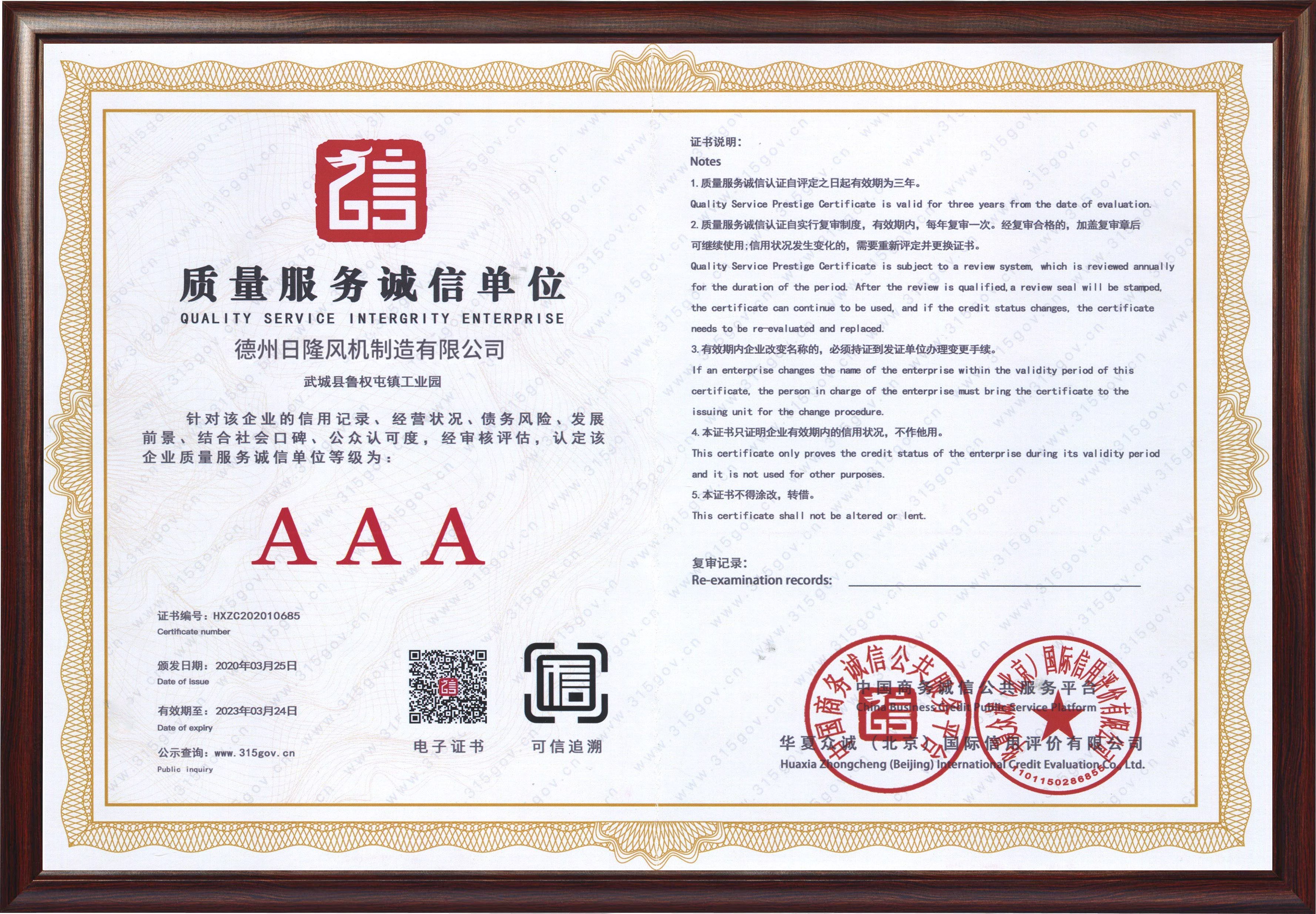 日隆風(fēng)機資質(zhì) -